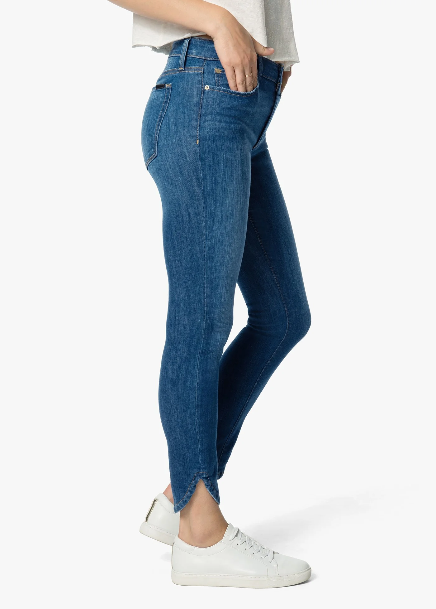 Curved hems add to the allure of the Icon Ankle jean in Vivicka, our mid-rise skinny jean made from soft stretch denim in a medium indigo wash. Fading and whiskering finish the look with lived-in appeal.